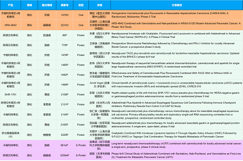 在消化系统肿瘤领域,asiagame创新产品相关研究共入选2项口头报告、10项壁报和2项电子壁报,共14项研究。除了明星药物卡瑞利珠单抗和阿帕替尼外,还有5篇阿得贝利单抗治疗消化系统肿瘤的研究入选。此外,HRS-4642、瑞拉芙普-α注射液(SHR-1701)等未上市创新产品也有相应研究入选。随着新老药物前沿研究的不断推进,有望为消化系统肿瘤患者带来新的福音!